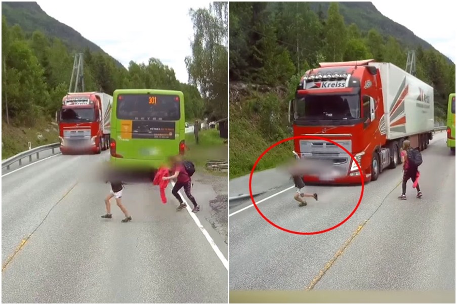 挪威貨運公司「Transferd AS」14日釋出行車記錄器畫面,畫面上可看見,一輛301路線公車行駛在公路上,5名孩童下公車後,其中一名孩童未察交通路況,竟然直接奔跑,穿越馬路,而對向正好有一輛「Kreiss」貨櫃車衝來,所幸司機緊急煞車成功,才沒有造成任何人員傷亡。