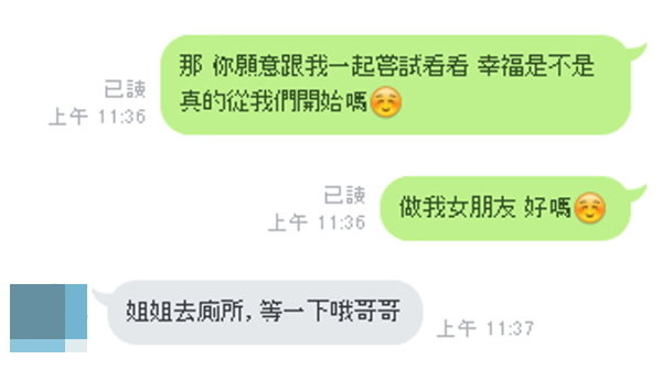 根據截圖內容,原PO說「那你願意跟我一起嘗試看看,幸福是不是真的從我們開始,做我女朋友好嗎」,結果獲得「姐姐去廁所,等一下哦哥哥」的回覆。