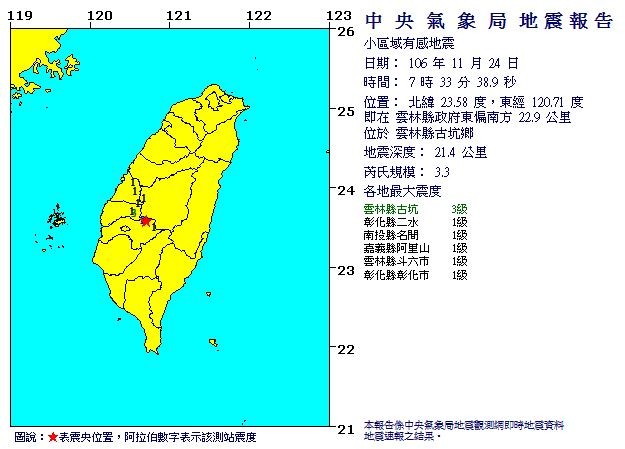 雲林縣古坑鄉24日早上7時33分許發生芮氏規模3.3的地震,根據中央氣象局地震報告,這起地震震央位於雲林縣政府東偏南方22.9公里處,震源深度21.4公里,最大震度為雲林古坑3級。