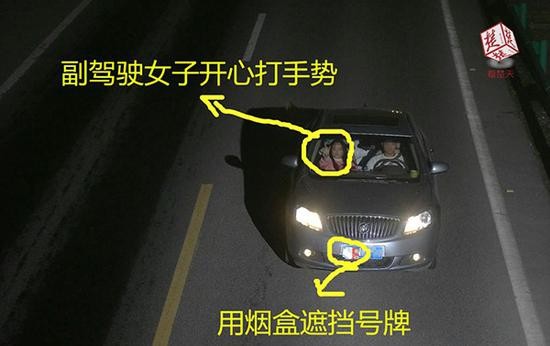 四川省滬蓉高速公路警察近日在對轄區測速系統進行違法行為篩查時,竟然在十分鐘內看,到兩輛汽車用菸盒和照片蓋住車頭車牌,以為這樣就可以騙過公路上測速照相機,即便超速也不怕開罰。其中一輛汽車內坐在副駕的女乘客還對鏡頭高舉「V」字手勢,頗為囂張,事後她聲稱只是「鬧著玩」而已。