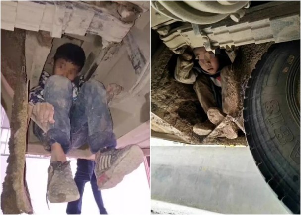 兩名8歲男童因過於想念在外地工作的父母,竟偷偷逃學並藏身於大客車車底,打算「搭順風車」去找爸媽,由於客車行駛路段較坎坷,兩名男童就隨著客車顛簸了80公里,直到終點站才被發現,所幸除了滿身泥巴外,並無受傷。