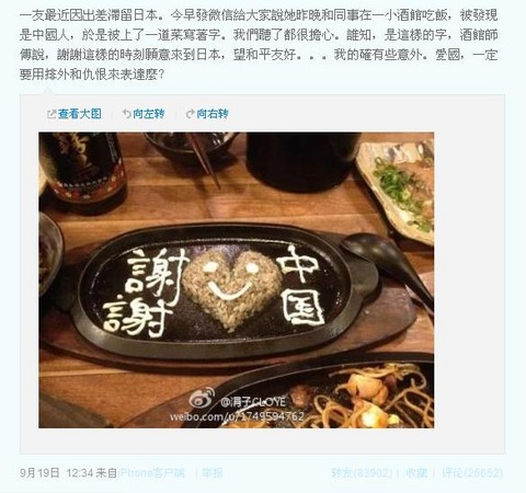 深圳一名女主持人在微博貼出照片,稱朋友因出差滯留日本,到酒館吃飯時,被發現是中國人,接著上了一道菜寫著「謝謝中國」,酒館師傅說謝謝在這敏感時刻願意到日本。她反思道:「愛國一定要用排外和仇恨來表達嗎?」對此,有網友給予肯定,但也有網友出言咒罵,她最終刪除該微博。