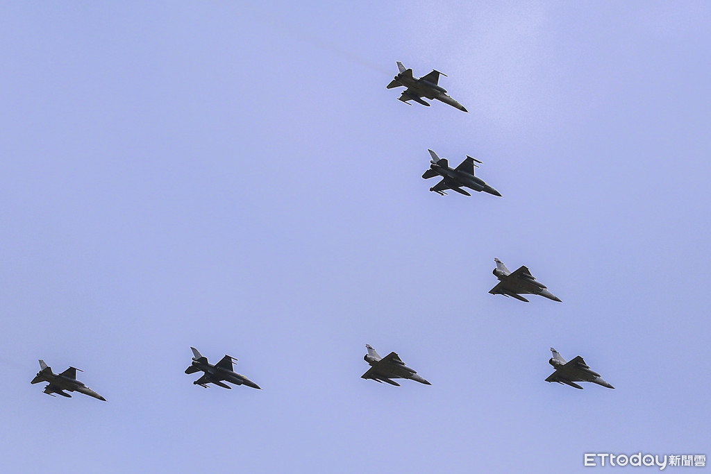 ▲空軍新竹基地營區開放全兵力預校-幻象2000(前三台),F-16(第三排),IDF(第四排)。(圖/記者黃克翔攝)