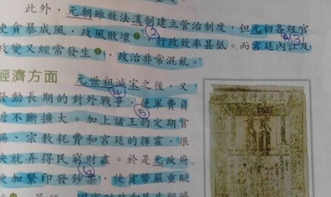 這位網友在臉書專頁「名校Secrets」上分享的歷史課本,內容是關於元朝,除了「此外」、「而」、「於是」、「最後」等連接詞,幾乎所有字都用藍色螢光筆畫上,字句間還有手寫的數字標示。這位網友說,之前中史堂(中國歷史課)老師叫我們標些重點,標著標著,整頁標完了。