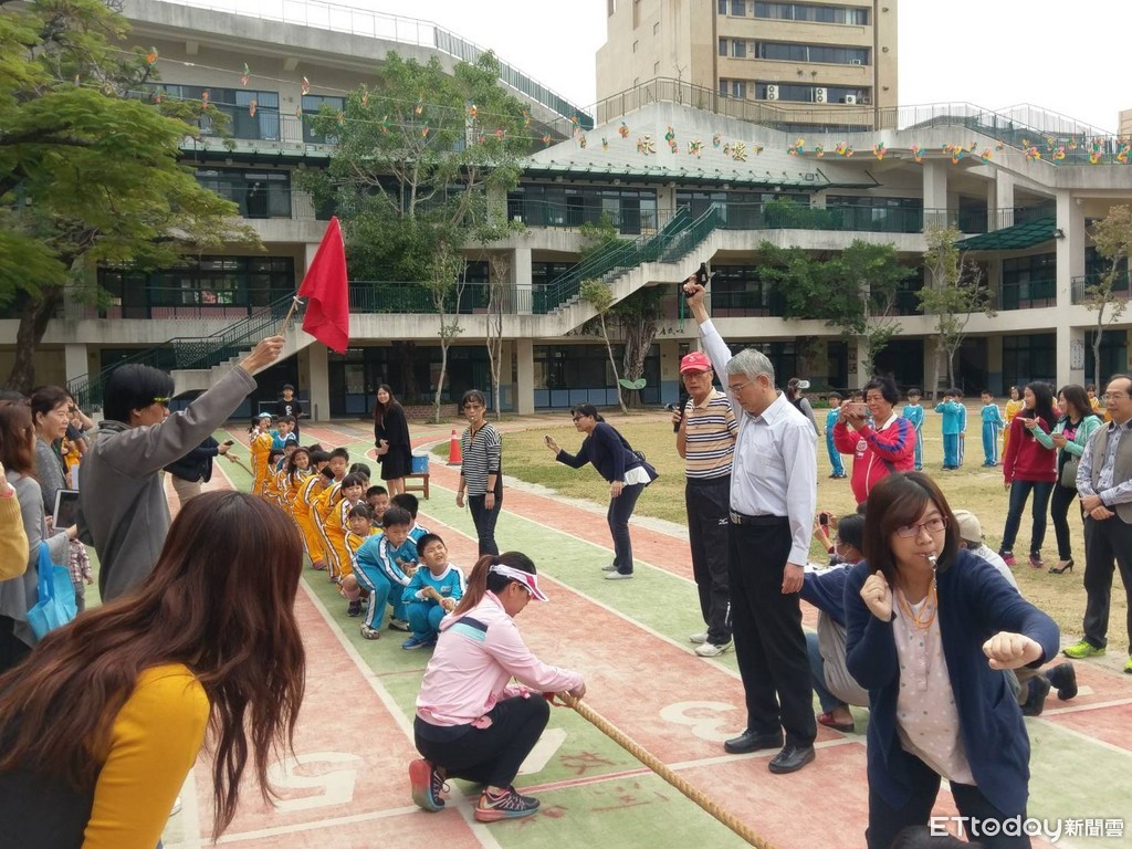 ▲台南市永福國小莊崑謨校長,熱情邀請二分局長王森瑒,為拔河比賽鳴槍。(圖/警方提供)