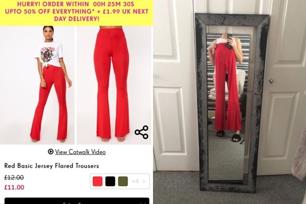 19歲的丹從購物平台「Pretty Pretty Thing」買了一條11英鎊紅色長寬褲,但到貨時實品讓她超震驚,不只長至胸部、不合人體工學外,穿上後看起來又醜又不修身,讓她氣得大罵「他們是不是以為大家都又瘦腿又長阿?」、「穿起來好像長蹼一樣」。