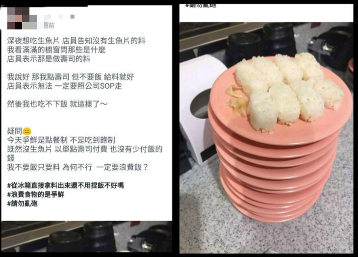 一名女網友深夜想吃生魚片,於是前往知名連鎖壽司店打牙祭,但店員告知生魚片賣完了,而櫥窗中的備料是拿來做壽司的,依公司規定無法單賣。不爽的她故意po出「剩飯照」,怒批店家不知變通、浪費食材;但大部分網友可不買帳,紛紛留言打臉「又是一個自以為是的奧客」、「EQ零蛋還敢來秀下限」。