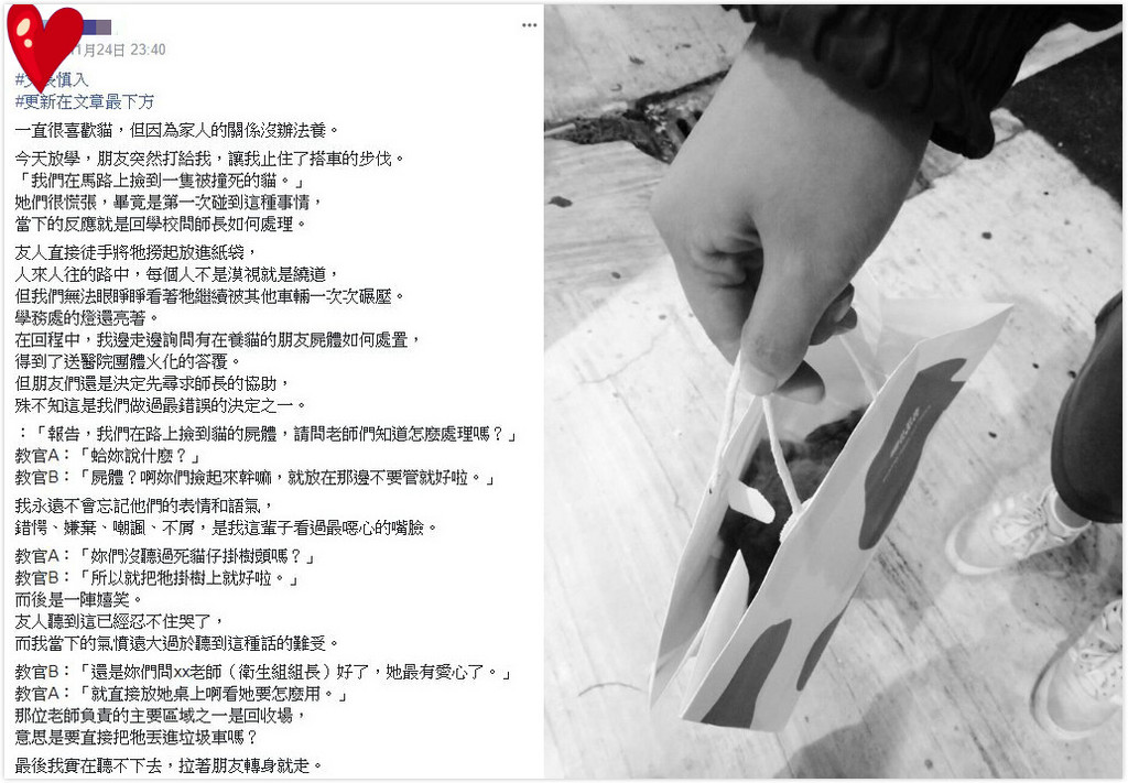一名女高中生日前和友人在路上發現被撞死的浪貓,於是回學校尋求師長協助,沒想到教官卻是以嘲諷、恥笑的態度回應,讓她們氣憤又難受,怒喊「為什麼要輕視甚至是拿這種事開玩笑?為人師表卻口出此言,我該慶幸我們是已具是非判斷力的高中生,而非可能因你一句話顛倒觀念的小孩嗎?」