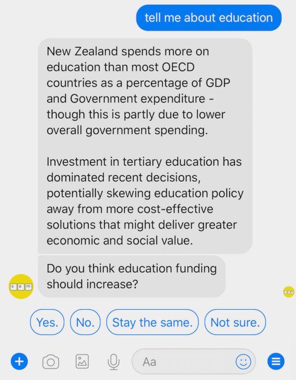 根據《Tech in Asia》記者實際如上圖與 SAM 討論教育議題,可以發現 SAM 先是闡述目前的現況,接著拋出一個問題詢問記者的看法,以這樣的談話方式來看,SAM 似乎不是一名擬定政策的政治人物,更像是彙整民意的對話機器人,不過技術還會持續進步,SAM 也需要更多有關紐西蘭當地的政治數據,Gerritsen 目前仍致力於教導 SAM 有關紐西蘭的特殊議題,包含教育、居住、移民等政策。