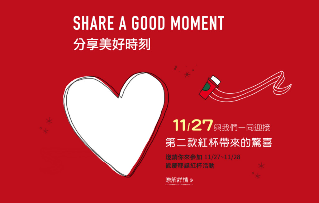為了推廣聖誕節新品包裝,凡是穿著紅色底or白色底or愛心相關的衣服、配件或飾品,至門市購買兩杯大杯冰熱/口味皆一致的飲料,其中一杯星巴克招待,每人每次至多買二送二。