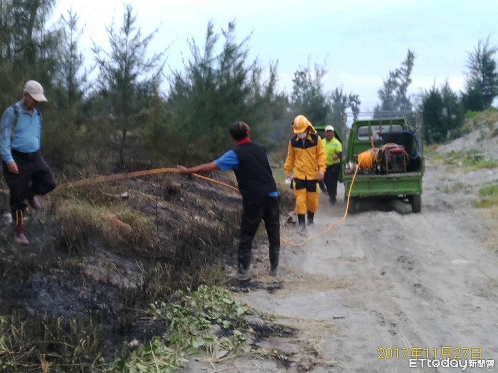 ▲台東縣太麻里鄉三和地區海邊農地垃圾堆不明原因發生火警,延燒一旁約1.4公頃的保安林。(圖/台東林管處提供 下同)