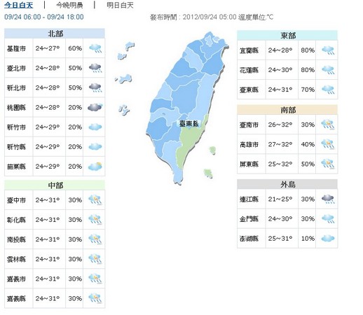 台灣24日受到東北季風增強的影響,迎風面的北部及東半部地區雲量較多而且有短暫陣雨,其中在宜蘭、基隆北海岸等地方有可能下雨的時間會稍微長一點,中南部地區依舊維持上午多雲到晴、午後有局部雷陣雨的型態。
