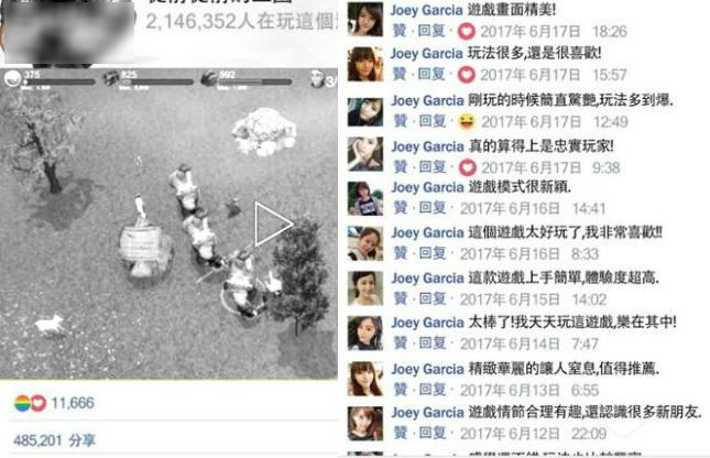 一名網友在臉書「爆廢公社」張貼一張截圖照,從畫面中可以看見,最上方顯示「2146352人在玩這個遊戲」的文字,下面的影片貼文則有11666人案讚,485201分享次數,還有多則讚美遊戲的留言,像是「遊戲畫面精美」、「玩法很多,還是很喜歡!」、「剛開始玩的時候簡直驚豔,玩法多到爆」、「這款遊戲上手簡單,體驗度超高」、「精緻華麗的讓人窒息,值得推薦」、「太棒了!我天天玩這遊戲,樂在其中」、「遊戲模式很新穎」。