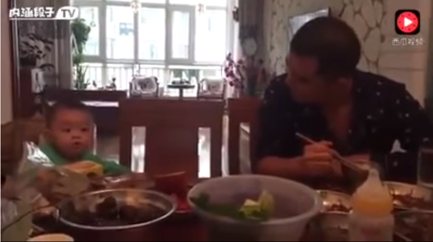 影片中可以看到,一家人坐在桌邊,桌上擺滿食物,爸爸正在大口吃飯,坐在兒童椅上的寶寶卻突然大哭起來,他馬上轉頭「殺氣騰騰」的看著寶寶,寶寶原先還不知道發生什麼事,繼續哭著,直到感覺氣氛不太對、慢慢收聲;但下一秒寶寶竟然是轉頭噘嘴「嗚嗚嗚」,好像在假裝「剛剛的哭聲是吹口哨」,爸爸也轉頭回去繼續吃飯。