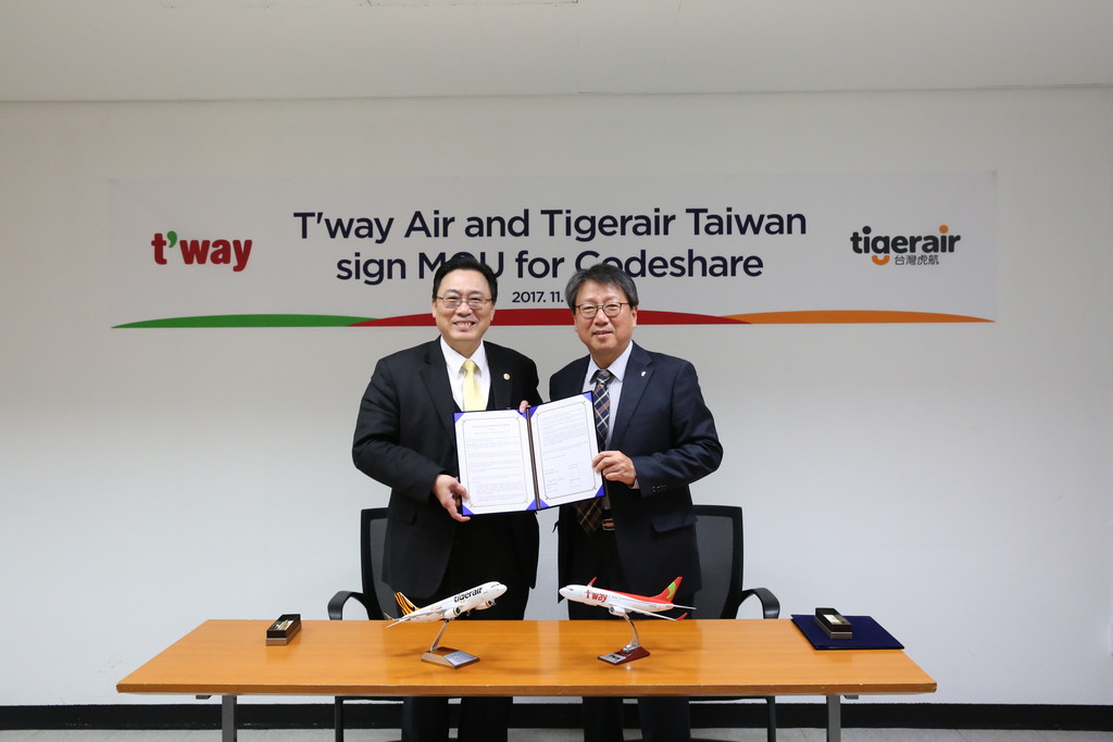 台灣虎航董事長張鴻鐘與德威航空(T'way Air)執行長鄭鴻根(Hong-Geun Jeong)27日在20多位相關人士的見證參與下,於金浦國際機場貨物中心的德威航空總部,進行合作備忘錄(MOU)的簽署儀式。未來雙方將進行共用班號合作,擴大航網,飛韓票價可望更殺。
