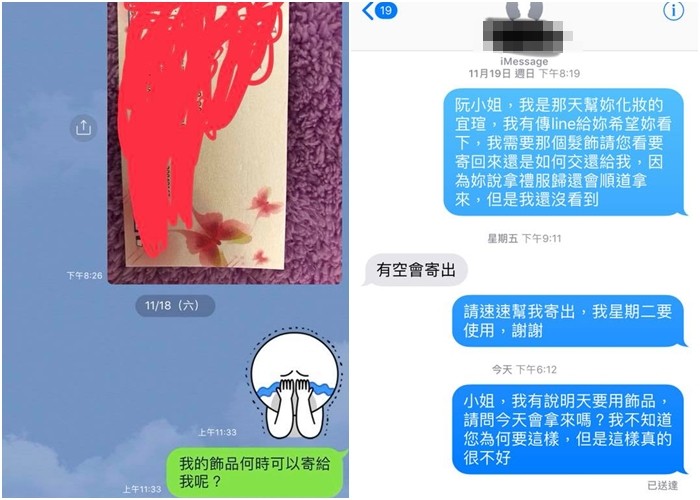 新秘其實一切都算了,最主要是飾品遲遲沒有還給她,「對方家人中間也進來要求梳化,一下要這樣畫,一下要這樣綁,心想……算了,接下來服務完畢跟我說頭上飾品隔天要還禮服,會順道拿來給我,結果等到現在過半個多月了,電話也不接,但有其他客人喜歡那個飾品指定要用,現在是怎樣……。」