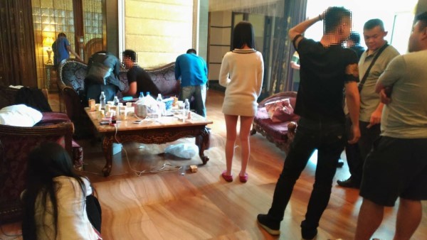 警方歷經多日埋伏、跟監,26日鎖定梁嫌舉辦轟趴處所後前往查緝,到達現場發現房間內傳來男女嘻笑聲,隨即入門檢查,現場除3名男子外還有2名傳播妹,警方在床上、桌上查扣k他命毒品、卡通造型凱蒂貓K盤、小惡魔咖啡包及吸食器等。