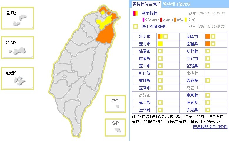 受到東北季風影響,中央氣象局今(30)日針對宜蘭、基隆北海岸以及大台北山區持續發布大雨特報,下午155時30分將宜蘭、基隆北海岸和新北市山區升級豪雨特報,提醒民眾注意瞬間大雨、坍方及落石。