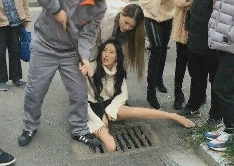 微博用戶「鄭州微娛樂」11月29日PO出4張照片,只見一名穿著白色上衣、黑色短裙的長髮正妹尷尬地坐在路邊,一手按著右腳大腿、一手緊緊壓著裙子避免走光,但仔細一看才發現,女子的右小腿竟然完全卡進水溝蓋的縫隙之中,還得勞煩一旁的工人用工具解救。