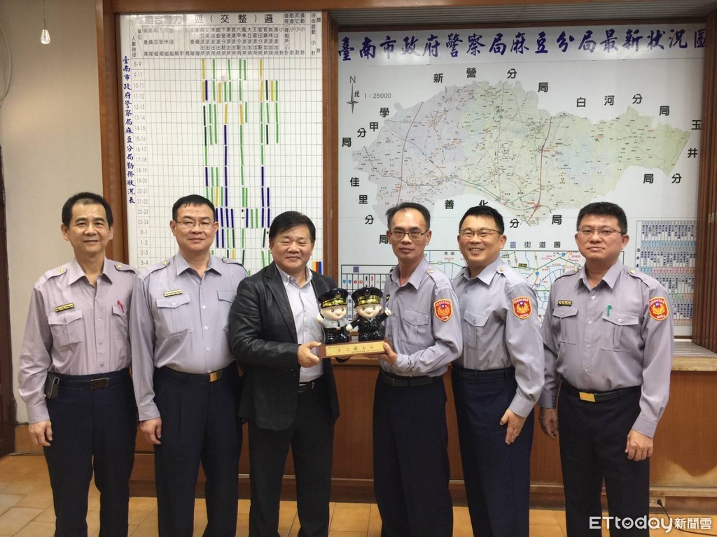 ▲台南市警麻豆分局保安民防組警員陳俊男,即將在12月4日退休,告別30年的警察生涯,麻豆分局長蔡進閱等人致送紀念品,感謝陳員付出,場面溫馨。(圖/警方提供)