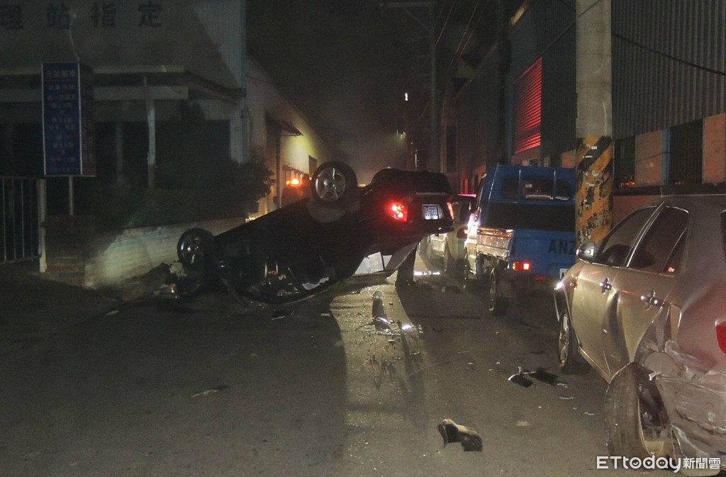 ▲27歲張姓男子駕駛自小客車,疑疲勞駕駛自撞停放在路邊的車輛而翻車,他肇事後逃離現場。(圖/記者林悅翻攝)