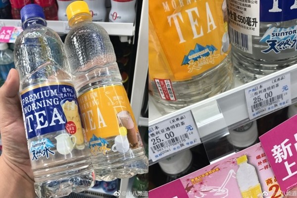 日本三得利(SUNTORY)公司天然水系列推出的「透明奶茶」、「透明檸檬紅茶」,由於外觀清澈如水、喝起來卻帶有茶香與奶香,吸引了許多消費者的關注,掀起一股搶購熱潮,不過有網友發現,大陸24小時便利商店「上海羅森」(Lawson)竟推出山寨版奶茶,還跟正貨放在一起賣。