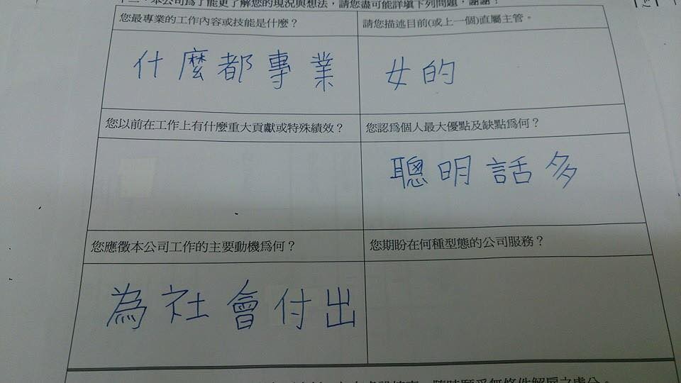 一名網友在臉書社團「爆廢公社」張貼一張照片,從畫面中可以看見,面試填寫單上共有6大題,第1題「您做專業的工作內容或技能是什麼」,只見下方答案寫著「什麼都專業」;第2題「您應徵本公司工作的主要動機為何?」,答案是「為社會付出」;第3題「您認為個人最大優點及缺點為何?」下方答案填寫「聰明話多」。