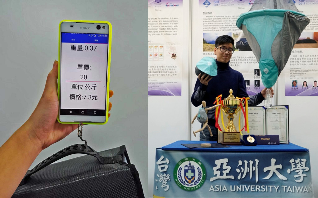 拿下大會首獎跟金牌的「捕露網」,則是亞洲大學商業設計系助理教授朱以恬帶隊、吳宗樺、張桓瑞、傅鈺庭等7位同學發明的「捕露集水裝置」,運用特殊布料製成的登山包,登山時可作為背包防水層,夜晚時可以懸掛樹上、漏斗式的設計也方便蒐集雨和露,一天可蒐集人體每日最低水份攝取量約600毫升,解決登山時面臨水源不足的問題
