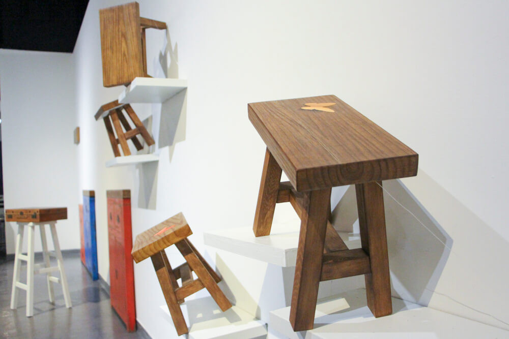牆面懸掛的木椅、皮箱與櫃子,看似一場經典復古的家具展,實際上卻是一張張畫布、一檔繪畫展。藝術家曾琡棻擅長透過寫實描繪的技法,擬仿各種材質肌理,運用組裝的畫布創造出3D立體物件,試圖模糊現成物與藝術品的界線,顛覆人們以往對繪畫的認知。