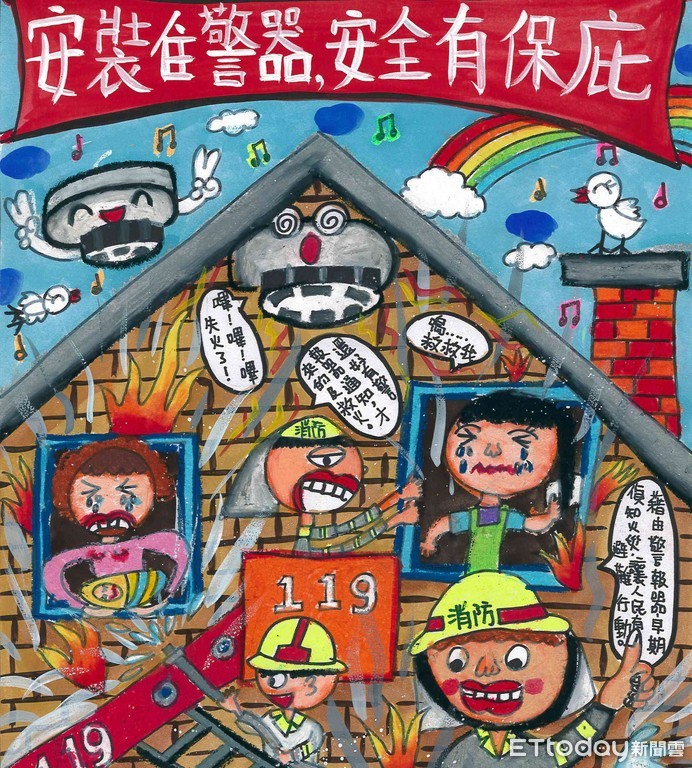 ▲消防署「宣導裝設住警器兒童繪畫比賽」,台南市國小勇奪低年級組特優及中、高年級組優等。(圖/記者林悅翻攝)