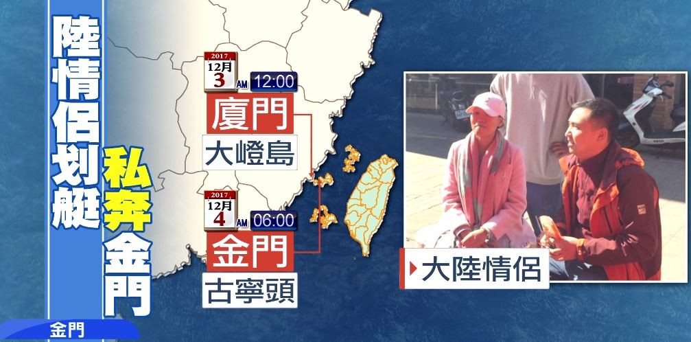 經海巡人員初步訊問了解,2名陸籍人士是情侶,於3日凌晨1時許自廈門大嶝島出發,沿途海象惡劣,划橡皮艇6小時候後接近金門島嶼,於是利用海上蚵架攀附上岸,想偷渡到金門地區謀生。