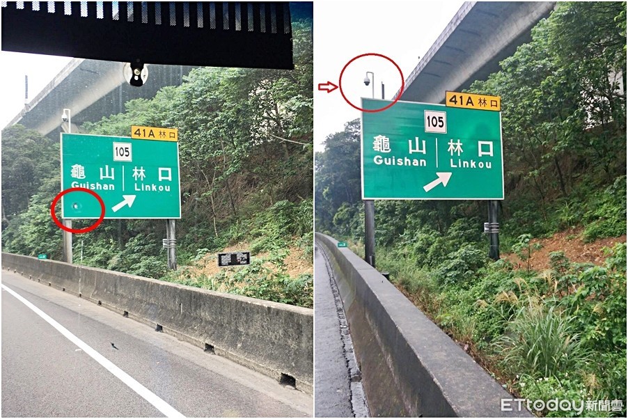 ▲網路瘋傳國1南下林口標誌牌被挖孔偷拍,其實是架天眼抓違規!