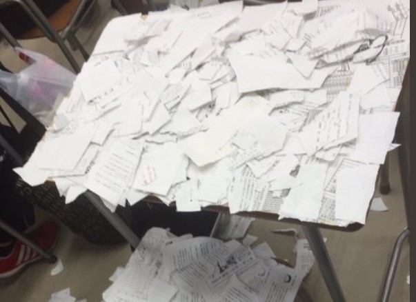 ▲女學生的桌子被灑滿碎紙,椅子上更有黏貼的碎紙。(圖/翻攝自@livedoornews twitter)