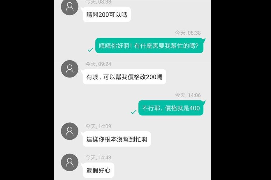 而網友在下午見到問題後,才回答對方不行降價,定價就是400元,不料,對方卻突然很生氣的說,「這樣你根本沒幫到忙啊,還假好心!」讓他無奈地說,「你可以選擇買,也可以選擇不買,喊價後我降不降價也是我的選擇,但不降價給你就假好心?是啥道理?我能給的幫忙,可能只有幫你打電話訂病房了」,並且直接加封鎖。