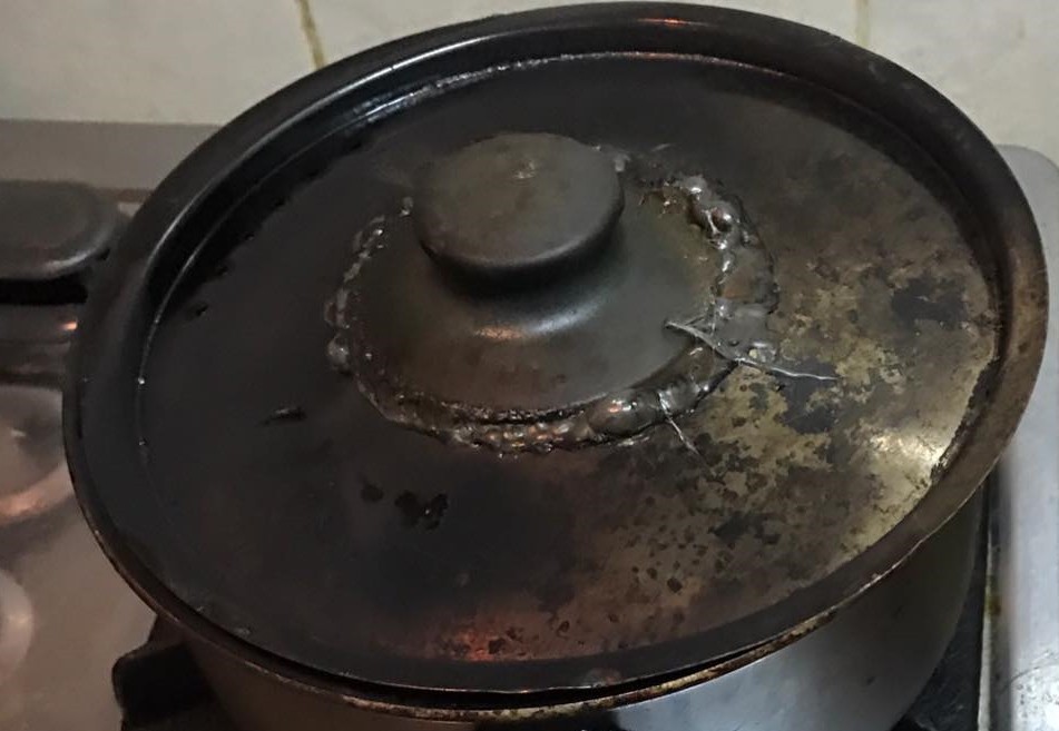 社企「加油香港」創辦人周佩波6日在臉書粉絲專頁貼出一張鍋子燒焦的照片,他表示,「工人姐姐蒸魚,為省時間,她竟同時用圖中此鍋加蓋煲滾油。結果鍋中食油加熱過度而自燃,燒著的滾油幾秒內已從煲蓋小洞彈出,燒著了整個煲蓋。按這個情況,三十秒火勢即會失控,引致火災。」