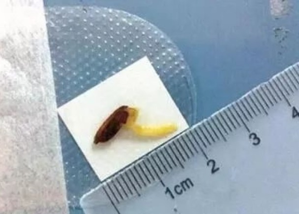 醫生使用工具從眼睛中取出異物查看,原來卡在陳婦眼睛裡的是一顆稻殼,稻殼的另一端還長出1公分長的黃色胚芽,他表示,眼睛裡的溼度與溫度可能剛好符合稻殼的生長條件,所以才會發芽,若是再晚一點才發現的話,有可能會損傷眼角膜,甚至可能失明。