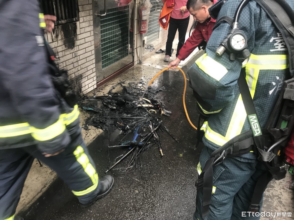 ▼住戶以及附近鄰居發現起火後趕緊拿滅火器滅撲滅火勢。(圖/記者柳名耕翻攝)