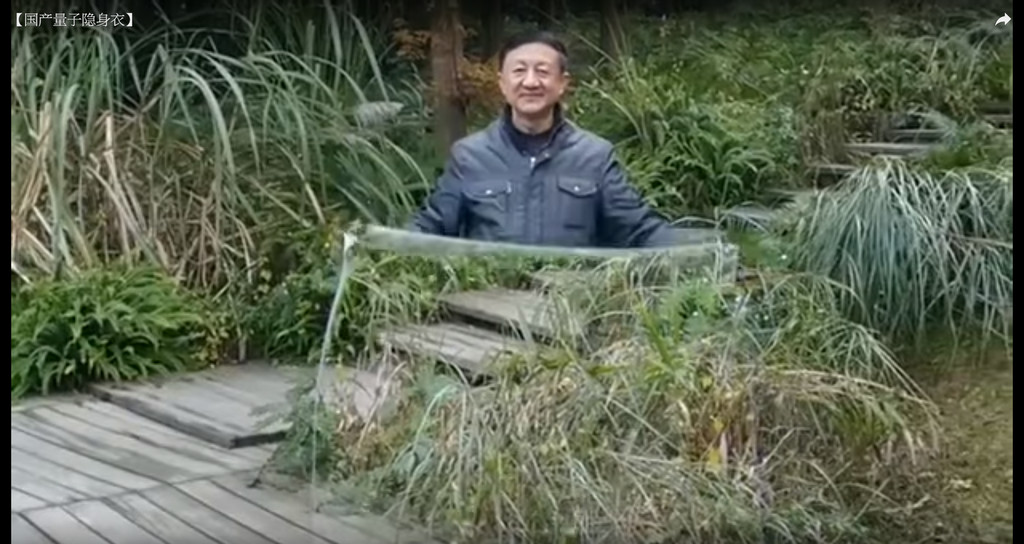 片段中可見,一名中年大叔手持一塊透明布,緩緩從樹林裡走出站在草叢中,當他將布展開於身前時,身體及頭部立即消失不見,但仍可清晰地看見其身後綠油油的草地,當他走近鏡頭時,可見雖然身體依然隱形,但「隱形衣」上有不少閃光點。