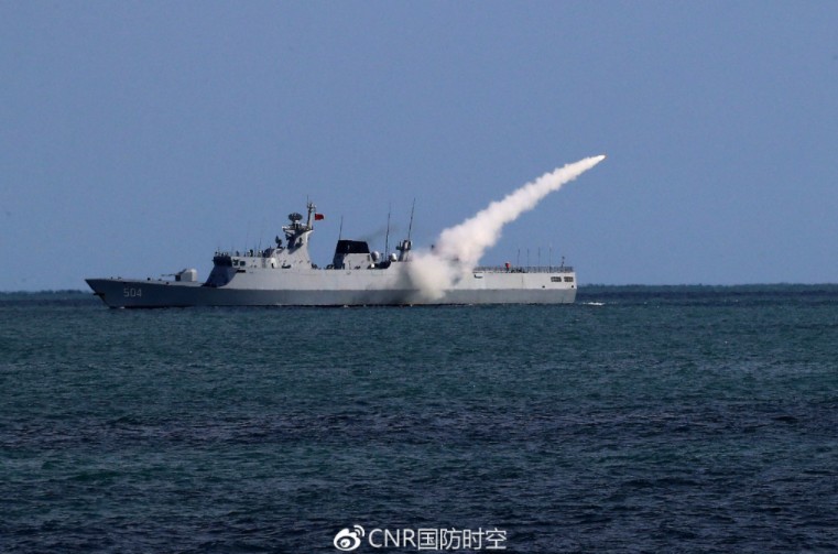 ▲中共某新型護衛艦於演習時射防空導彈。(圖/翻攝自CNR國防時空微博,下同)
