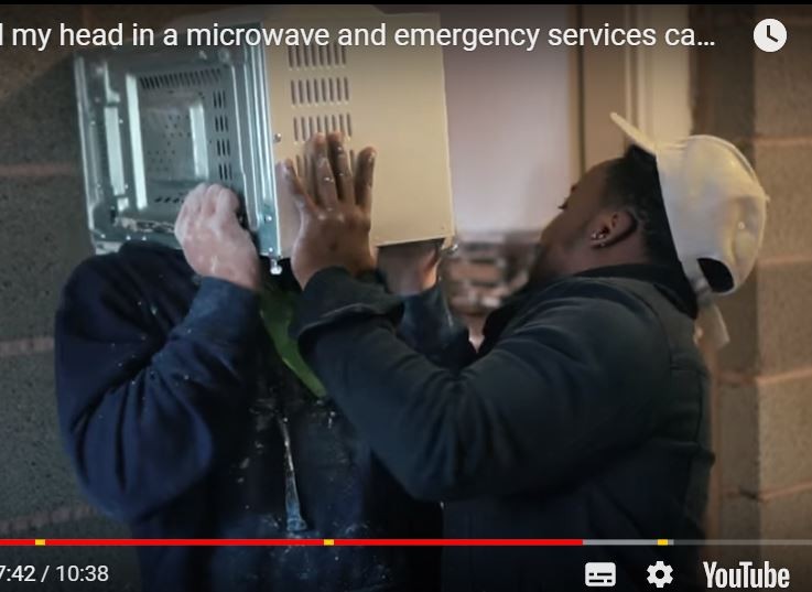 據《每日郵報》報導,英國西米德蘭茲郡一位22歲的youtuber傑‧斯溫勒〈Jay Swingler〉,在當地時間7日下午在自家車庫裡與朋友拍攝搞怪影片,斯溫勒將整個頭塞入微波爐裡,再灌入7袋的「模型用填充膏」,只插入一根水管當作呼吸器,為了加速凝固,他的朋友還拿吹風機吹了10分鐘。當斯溫勒開心地站起來要把微波爐拔起來時,才發現頭深深卡住。朋友嚇得想把微波爐拆開,不過頭根本無法拉出,這時候斯溫勒呼吸越來越困難,只好趕緊打電話給消防隊來救人。
