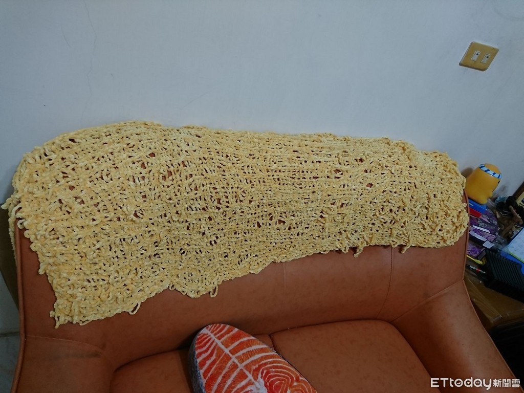 「我利用下班的零碎時間,一邊看電視、一邊織圍巾,前前後後至少花了2個禮拜,才終於織出來……!」照片中,這條米色圍巾成品披掛在沙發上,但卻因顏色問題、且編織縫隙太大,網友猛然一看還以為是超大版的科學麵,陳韻婷的同事見了也笑翻,直呼根本就是「菜瓜布」。陳韻婷說,對於同事們嘲諷有一點傷心,至於網友說像泡麵什麼的,「我只能說他們想像力太豐富了!」