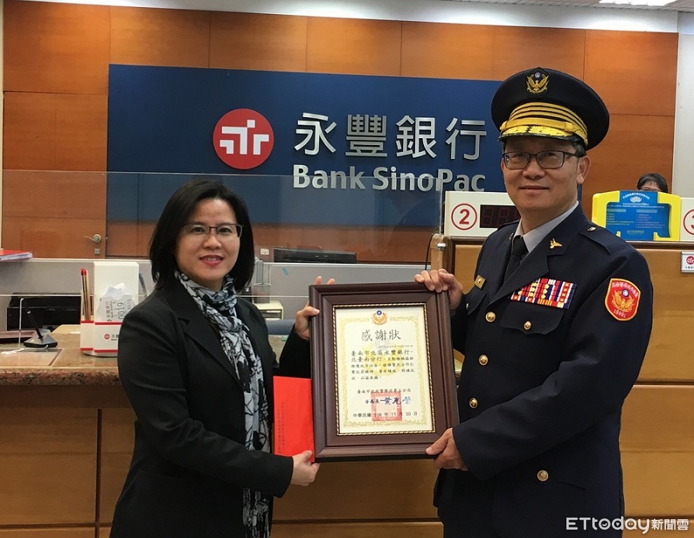 11月30日台南市警五分局公園派出所,接獲西門路永豐銀行報案,有民眾疑似遭詐騙,警員翁聖和、劉芳序立即到場了解,經查為陳姓女子被一名自稱外國上將的男性網友,因急需用錢為由,詐騙16萬元,警方及時勸阻,五分局長黃光榮8日下午4時親自前往永豐銀行頒發感謝狀及禮券,感謝行員主動積極協助阻詐維護治安。