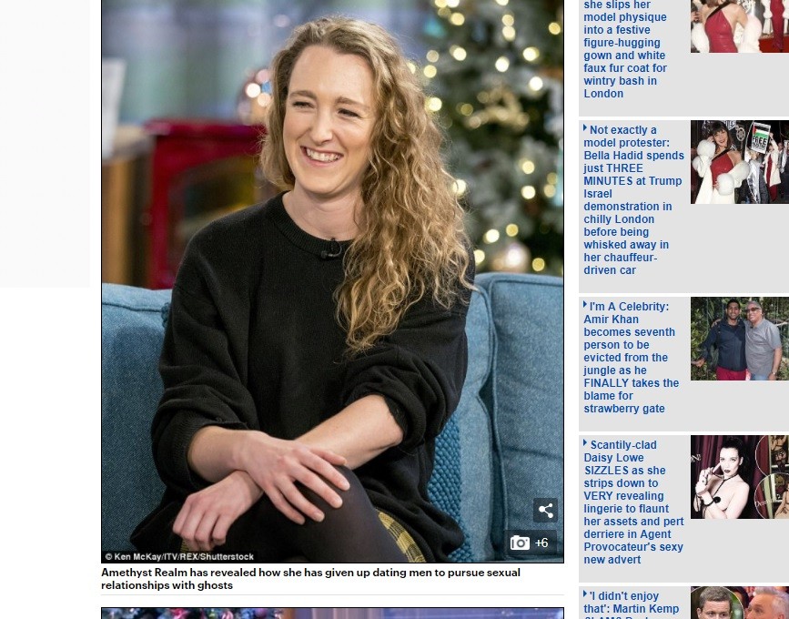 根據《每日郵報》報導,27歲的里姆(Amethyst Realm)透露,10年前跟未婚夫搬進新居後,感覺到有「東西」的存在,第一次在臥房與鬼發生性愛關係,「那很難形容,感覺上有一個重量壓在大腿上,並且有呼吸的氣息與撫摸。」