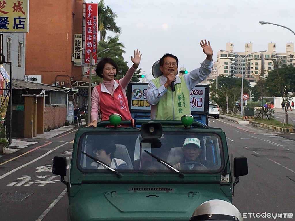 ▲台南市長參選人陳亭妃,偕同市議員蔡旺詮,9日在東區進行車隊遊街活動,力邀大家參加10日東區暨教育後援會成立大會。(圖/陳亭妃提供)