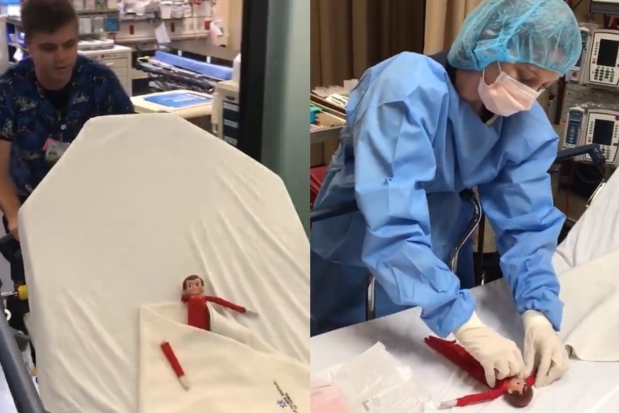 為了讓奧比莉繼續相信聖誕老人和精靈的故事,所有大人都一起幫忙,珍妮佛先是把Sam小心放在毯子上,送到醫院之後,立刻就出現一群專業的醫護人員推著病床,把重傷的Sam推到急診室,再由專業的醫生幫忙動縫合手術,手術前還拿出「神奇聖誕手套」(Magical Santa gloves),這段過程全被錄下來,好讓奧比莉確認她的精靈有接受治療。
