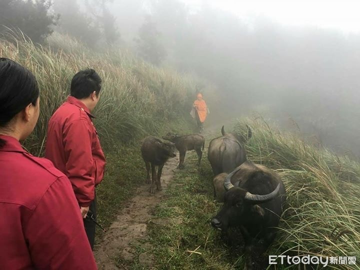 水牛群共4頭,悠閒走動卻沒有離開步道的樣子,因為山上天暗較早,又陰雨綿綿,夫妻檔擔心萬一牛隻到天黑都不走,加上貿然自行驅趕牛群恐怕引起攻擊,走草叢又怕地形不熟,反而滑落山谷,只得「受困」在牛群後方,盡量保持距離,打電話向國家公園管理處求助。