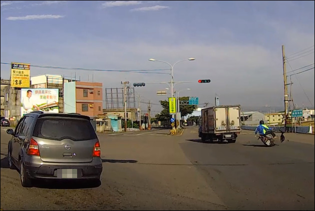 ▲貨車闖紅燈,擦撞正要左轉的機車騎士。(圖/爆料公社,下同)