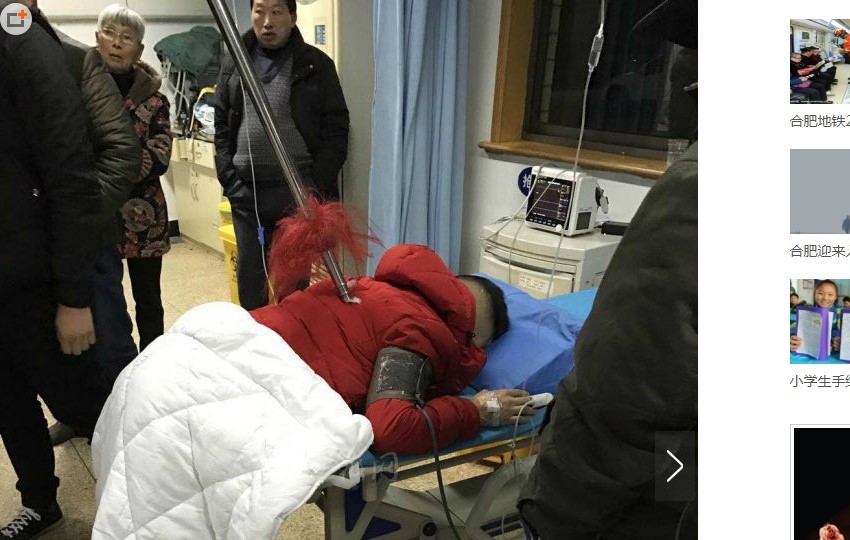 安徽省黃山市一名穿著紅色外套的男子日前突然在深夜衝進黃山市人民醫院掛急診,他的背上還插著一把超過2公尺的「紅纓槍」;由於槍頭插得太深,醫護人員擔心拔出來會導致大出血,只好先截斷部分槍桿再讓他跪趴在病床尾端,最後轉送至另一間設備更好的大醫院進行治療。