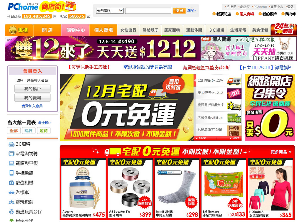 雙12將至,PChome商店街宣布免運策略從超商擴大至宅配,用新服務吸引網購族,並進一步刺激購買意願。黃淑琳強調,此次雙12加碼新推出「宅配0元免運」優惠活動,參加店家數多達4萬家,集結了網路上最多的宅配免運商品,共有1,000萬件商品讓消費者自由選購,可一起結帳,同時又可以享有0元宅配,免運費送到消費者指定地點。繼超商0元免運後,再掀另一波網購免運潮。