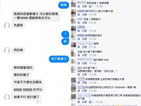有些人有特別的性癖,但還是要以尊重他人為主,一名男網友分享了朋友被騷擾的對話截圖,該名有戀物癖的男子竟出1萬元的高價收購一雙襪子。該文一出,許多女網友也暴動大喊,「我賣」!